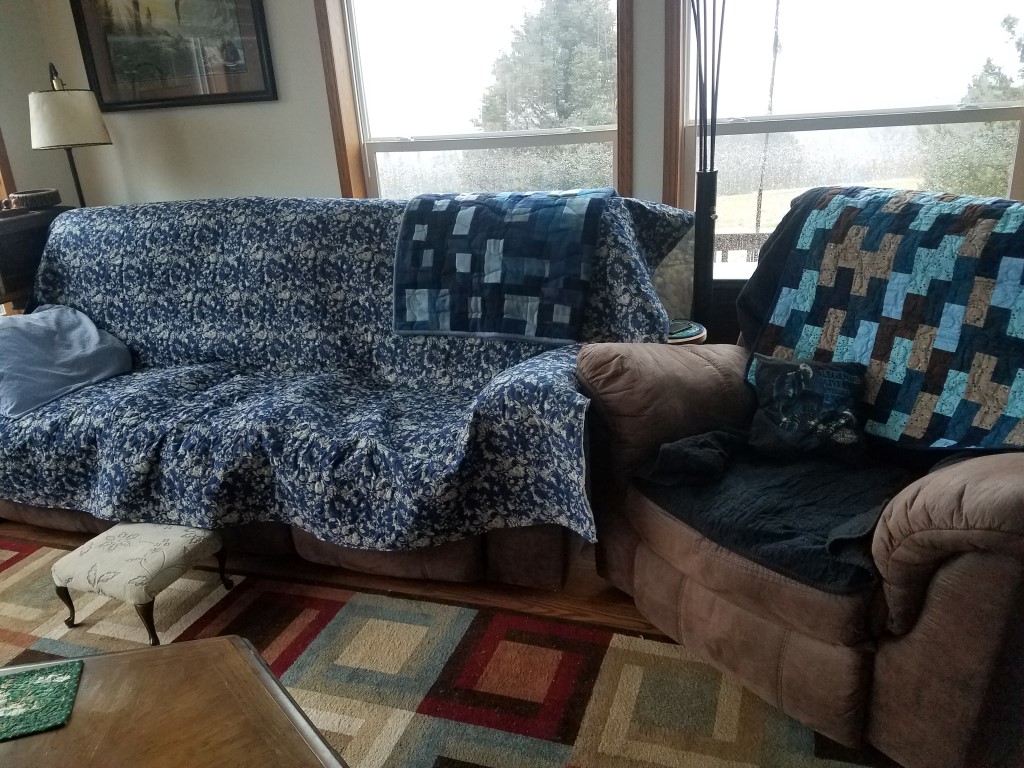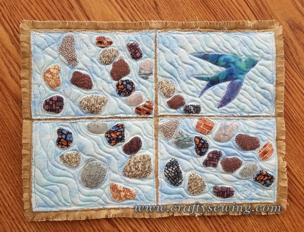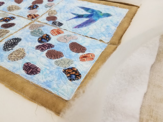At this time, add the backing fabric and stitch a border. See the photo below of the Blue Sunflower and I stitched a chain stitch for the border.