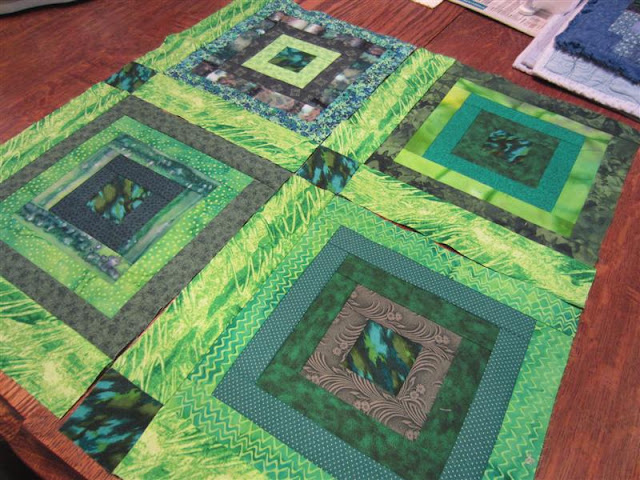 The courthouse round block is a fun block to make especially when using scraps. There are about 40 different green fabrics in this quilt. We are pretty sure there are no duplicate blocks. There is a one draw back to using so many different fabrics. They are all different weights and thicknesses, even though they are all 100% cotton fabrics. Some of them stretch and pull a little. All in all, I love how it is looking!