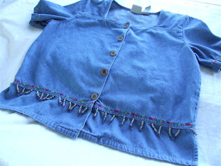 I transformed (upcycled) this beaded denim shirt into a table topper quilt and hot pads.